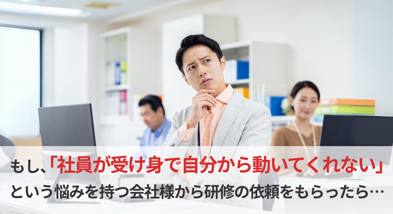もし、「社員が受け身で、自分から動いてくれない」という悩みを持つ会社様から、研修の依頼をもらったら…